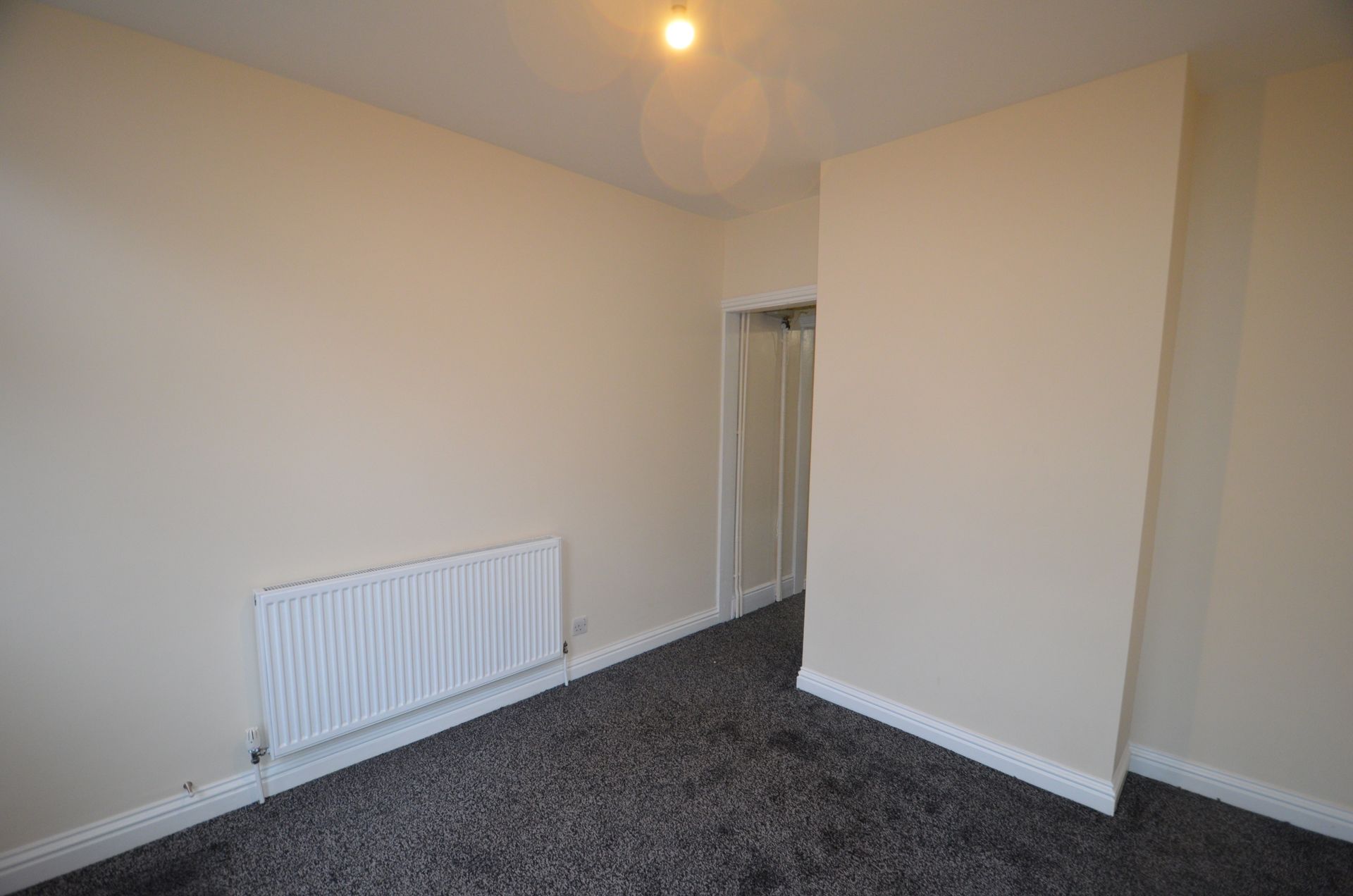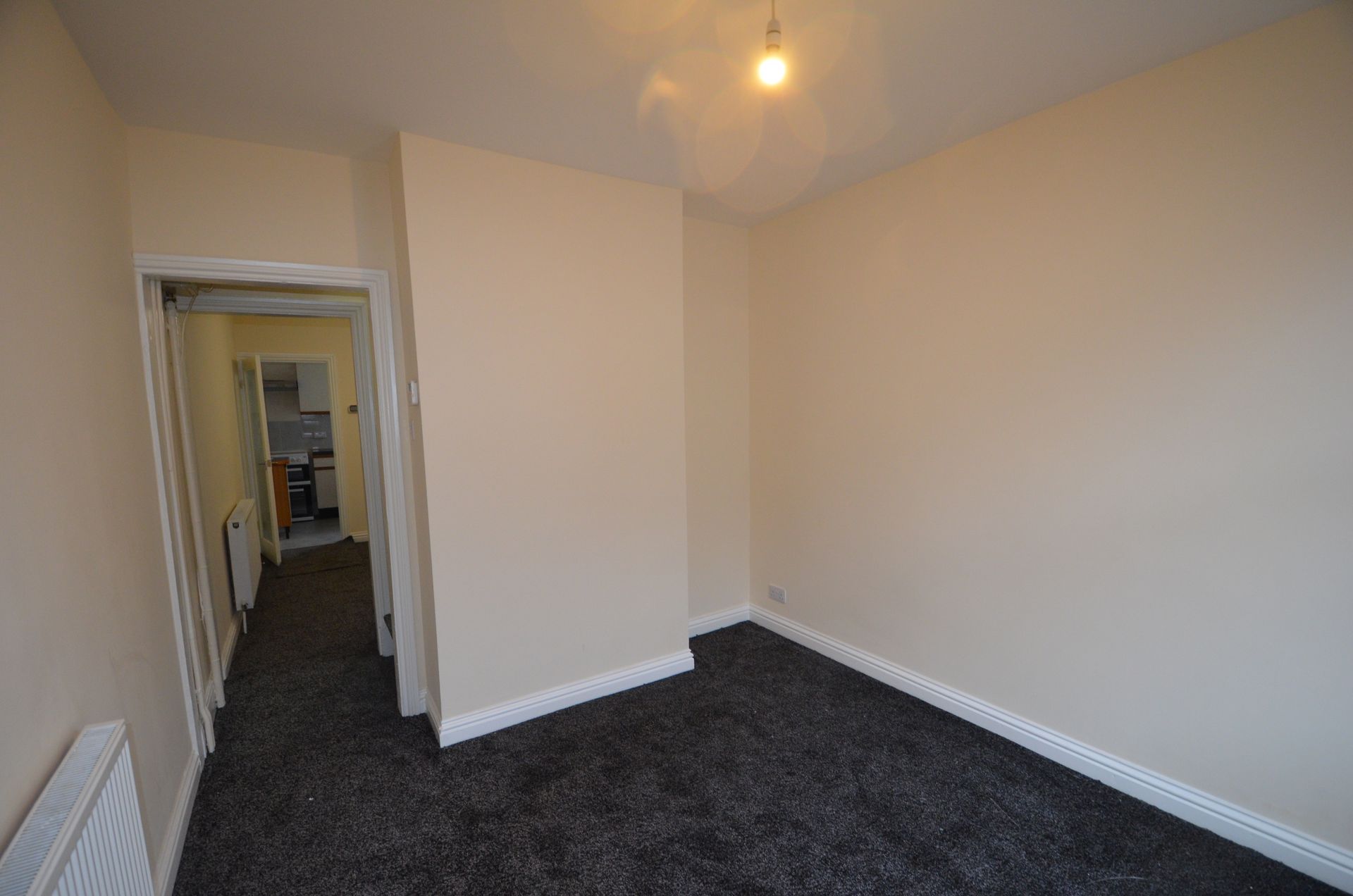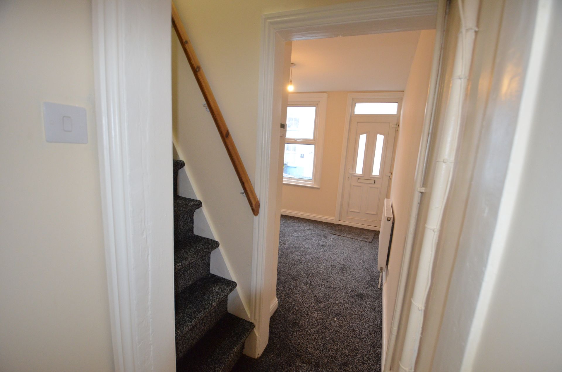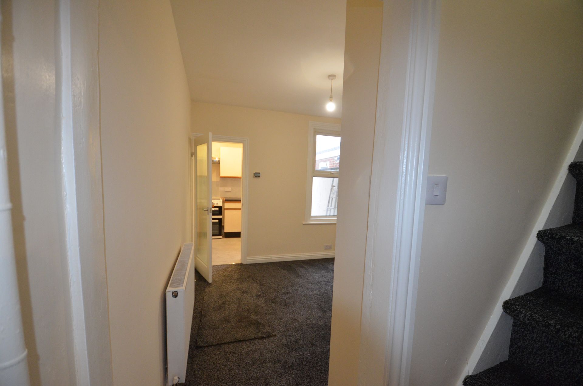 Front aspect double glazed window, uPVC front entrance door, radiator, ceiling light, and carpeted floor.