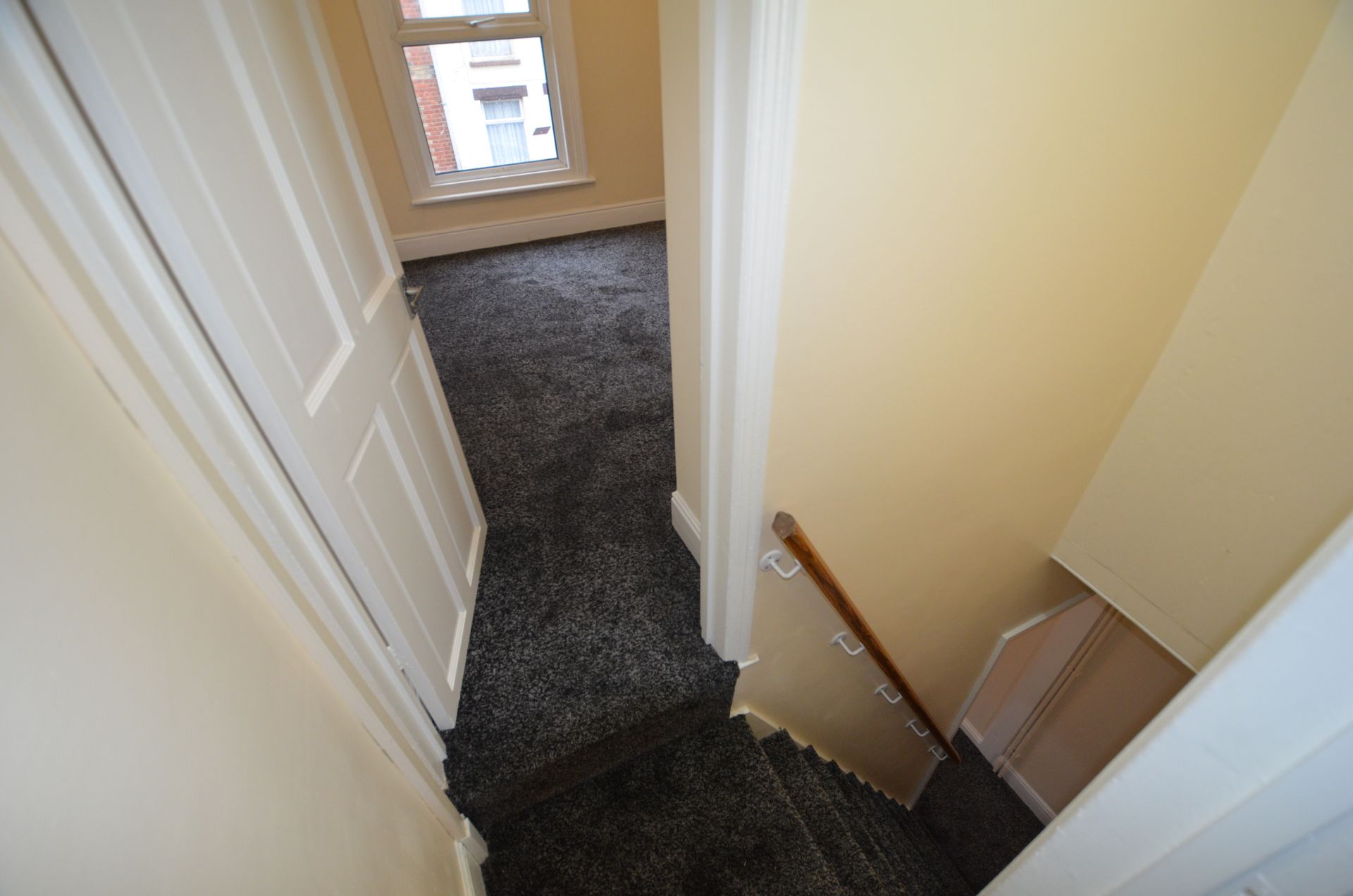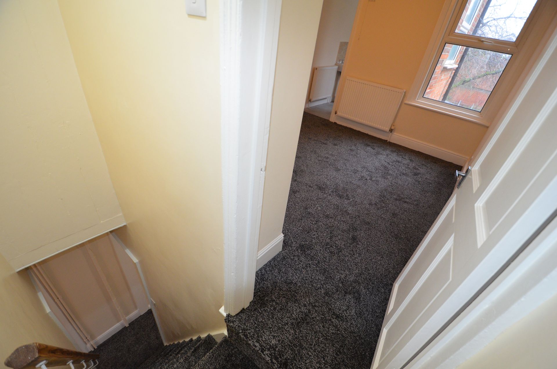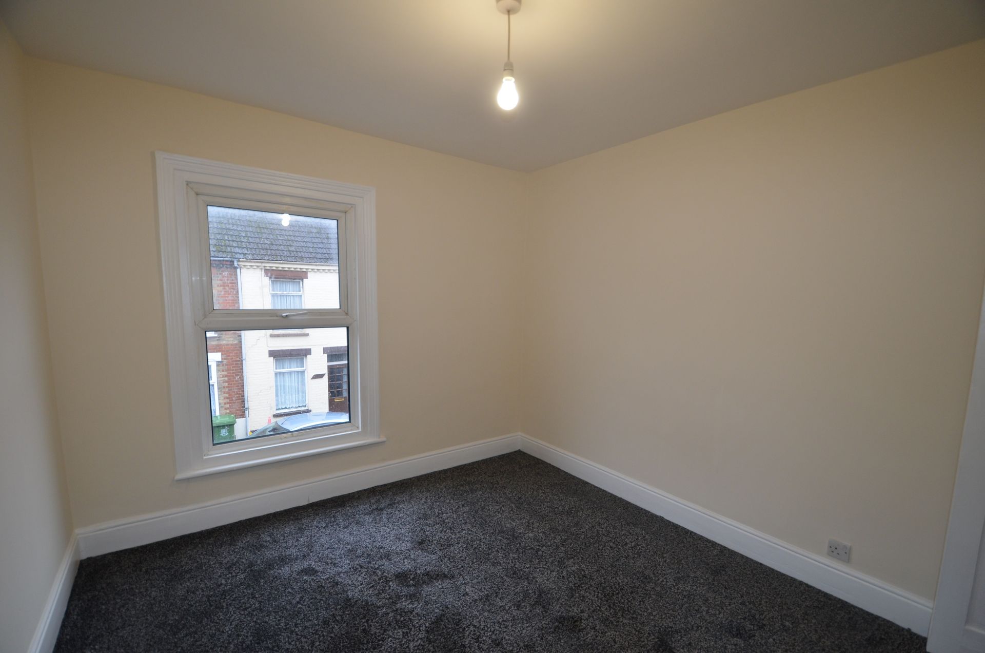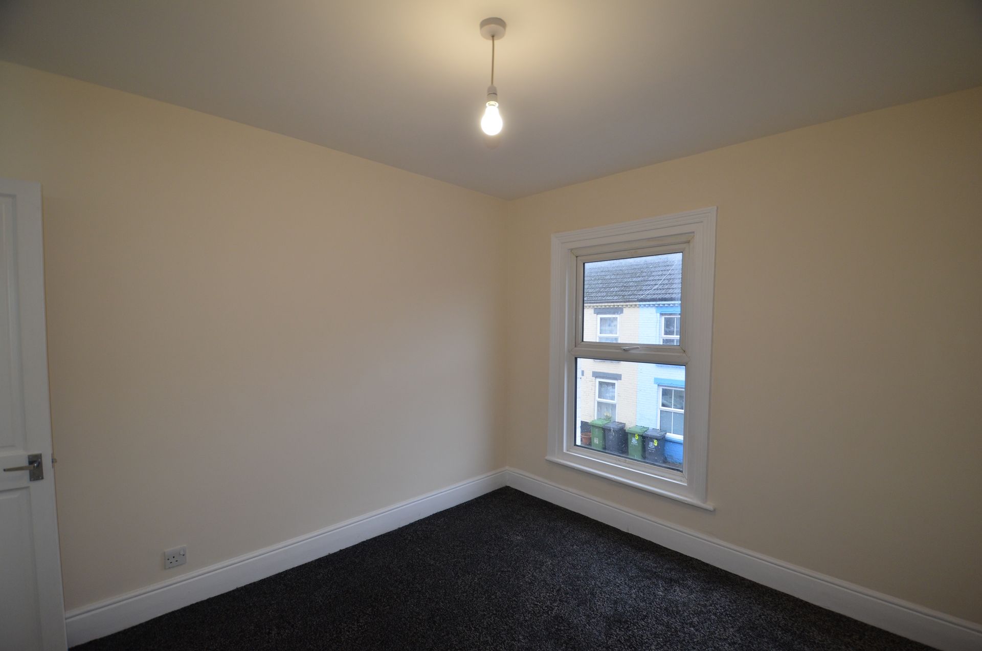 Front aspect double glazed window, uPVC front entrance door, radiator, ceiling light, and carpeted floor.