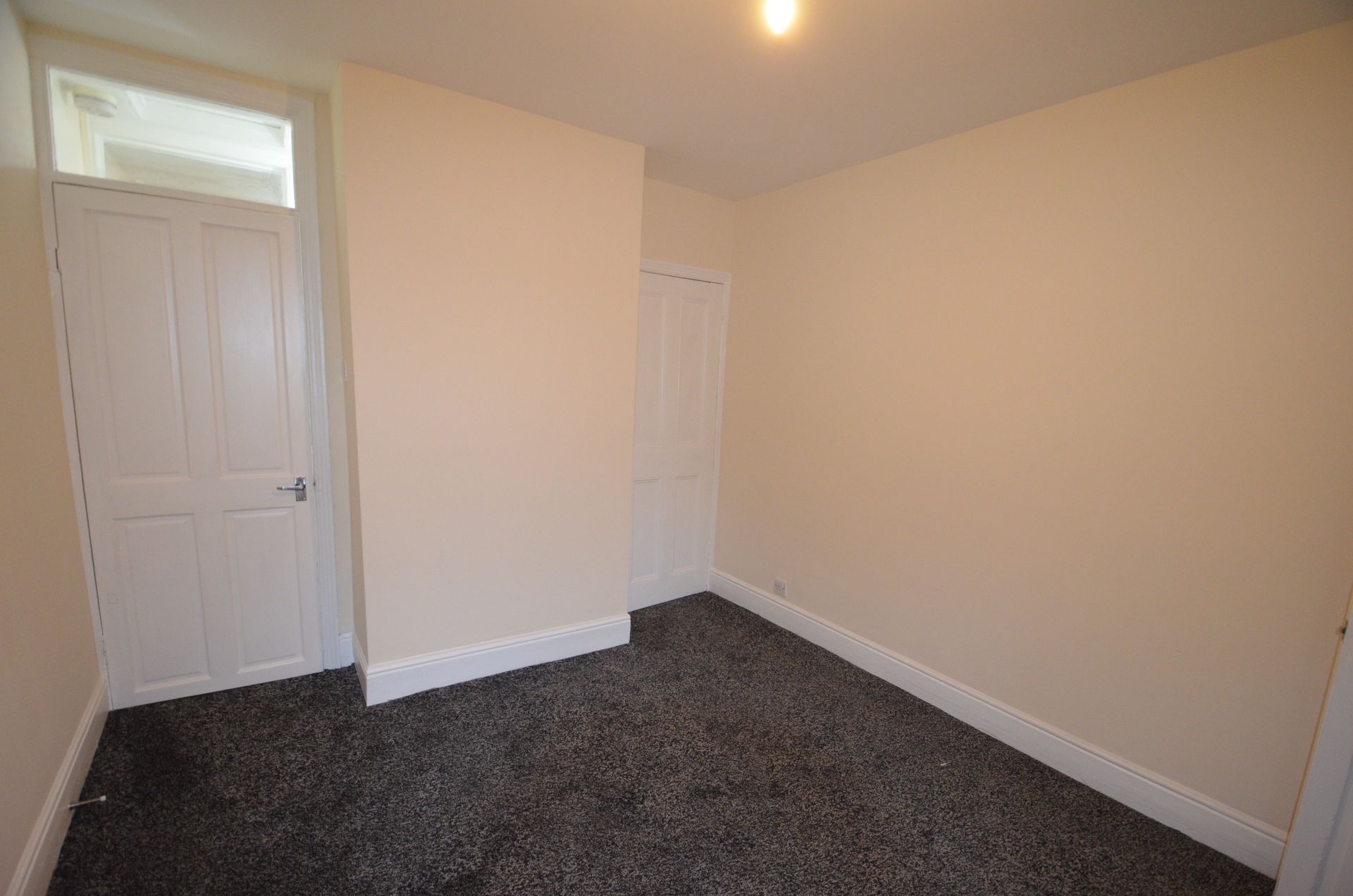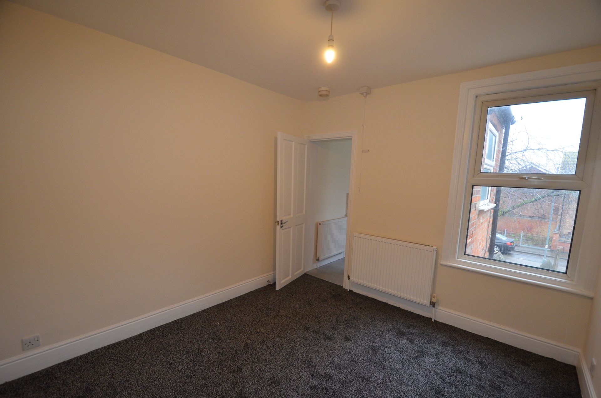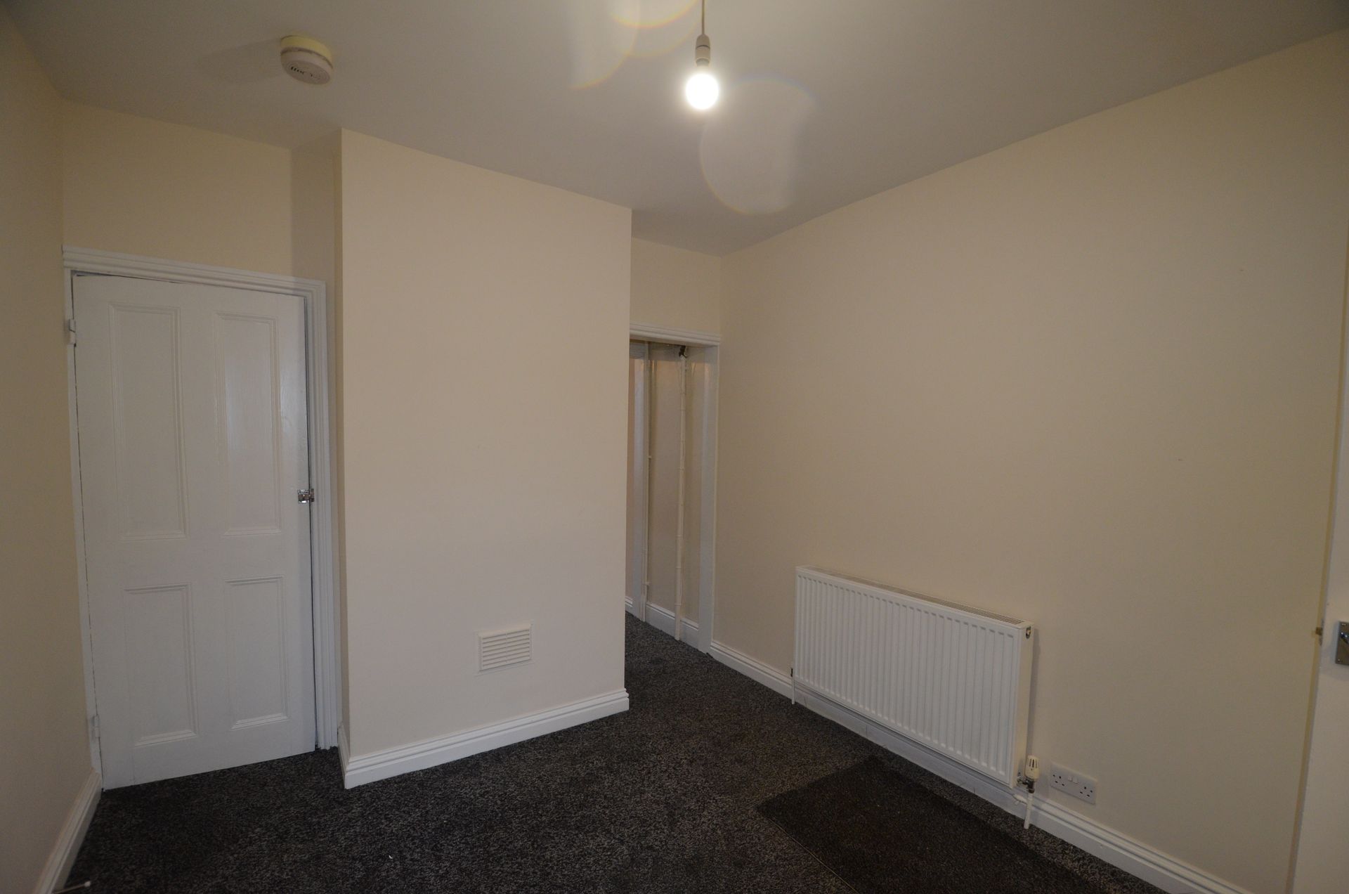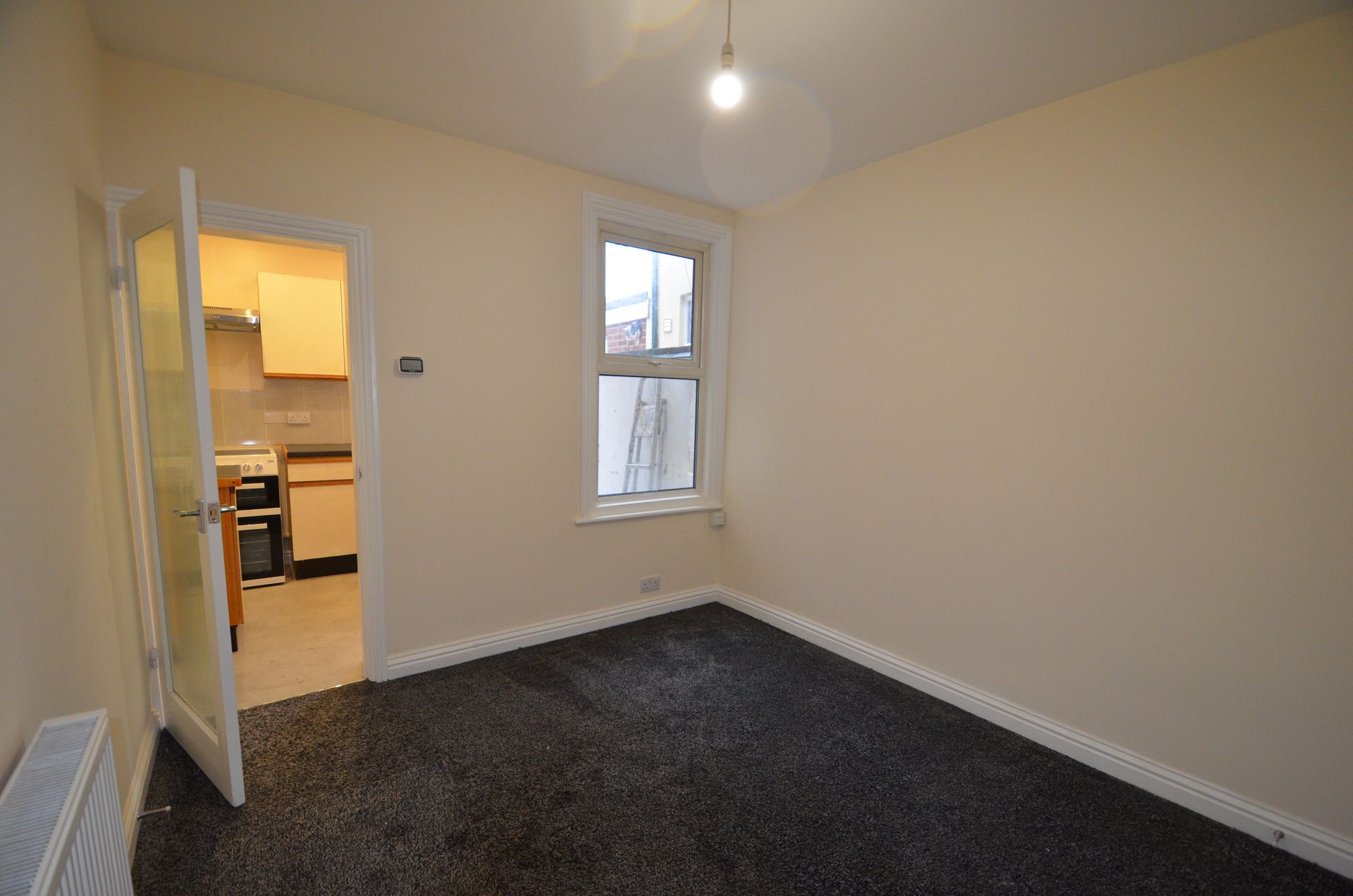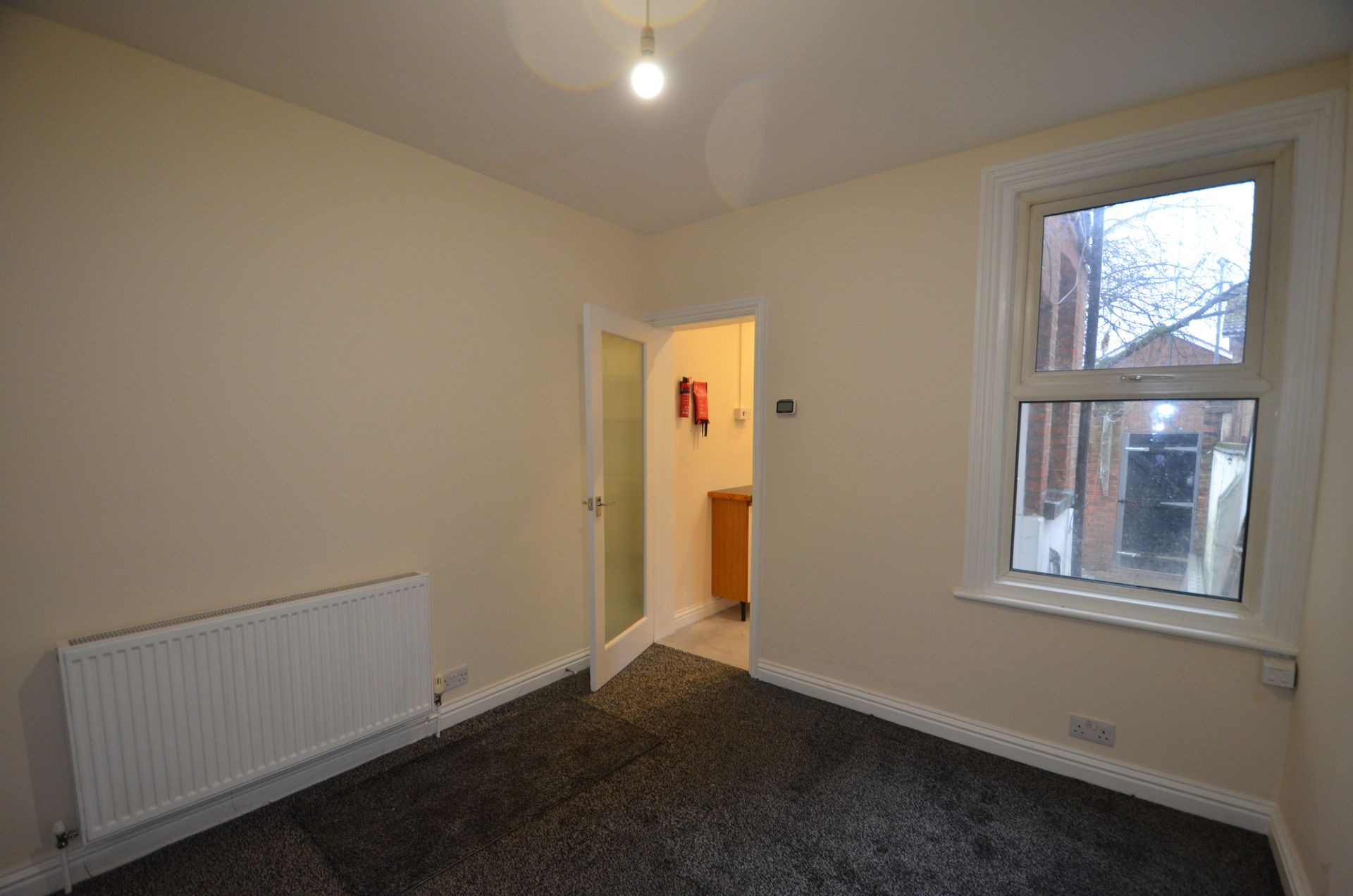 Rear aspect double glazed window, radiator, built-in storage cupboard, fire alarm, ceiling light, and carpeted floor.