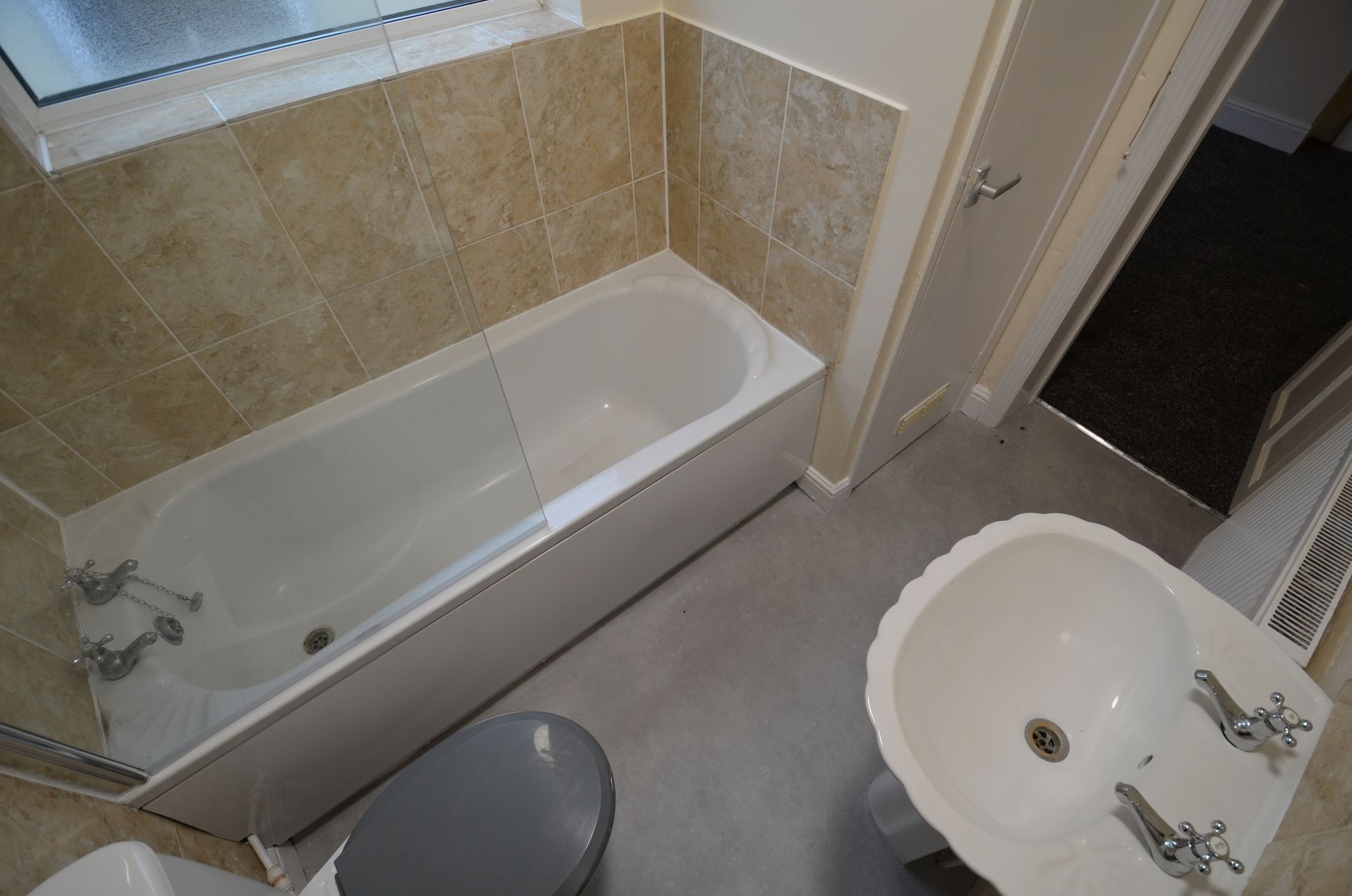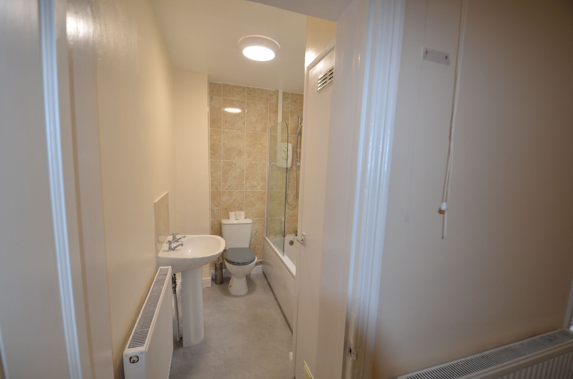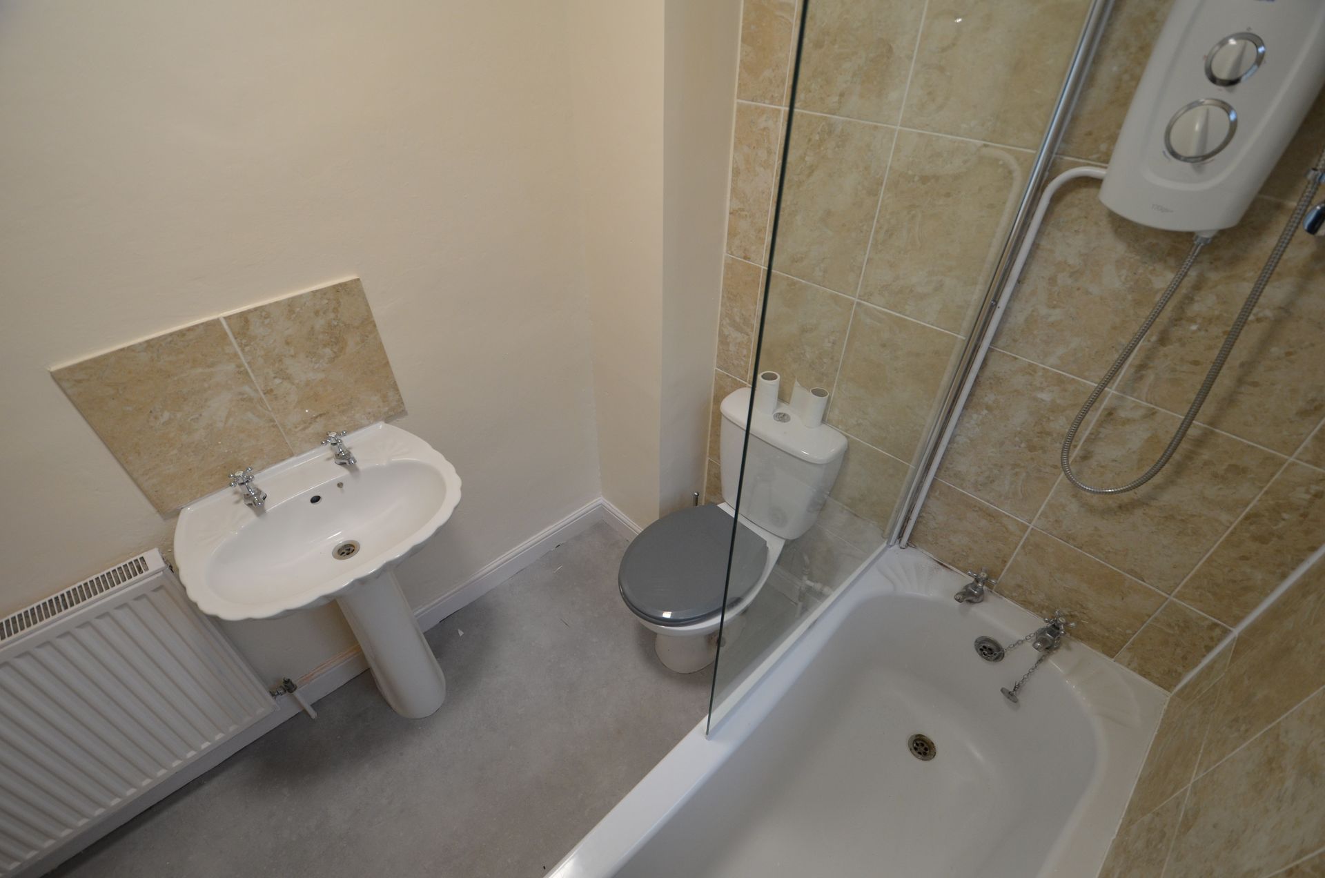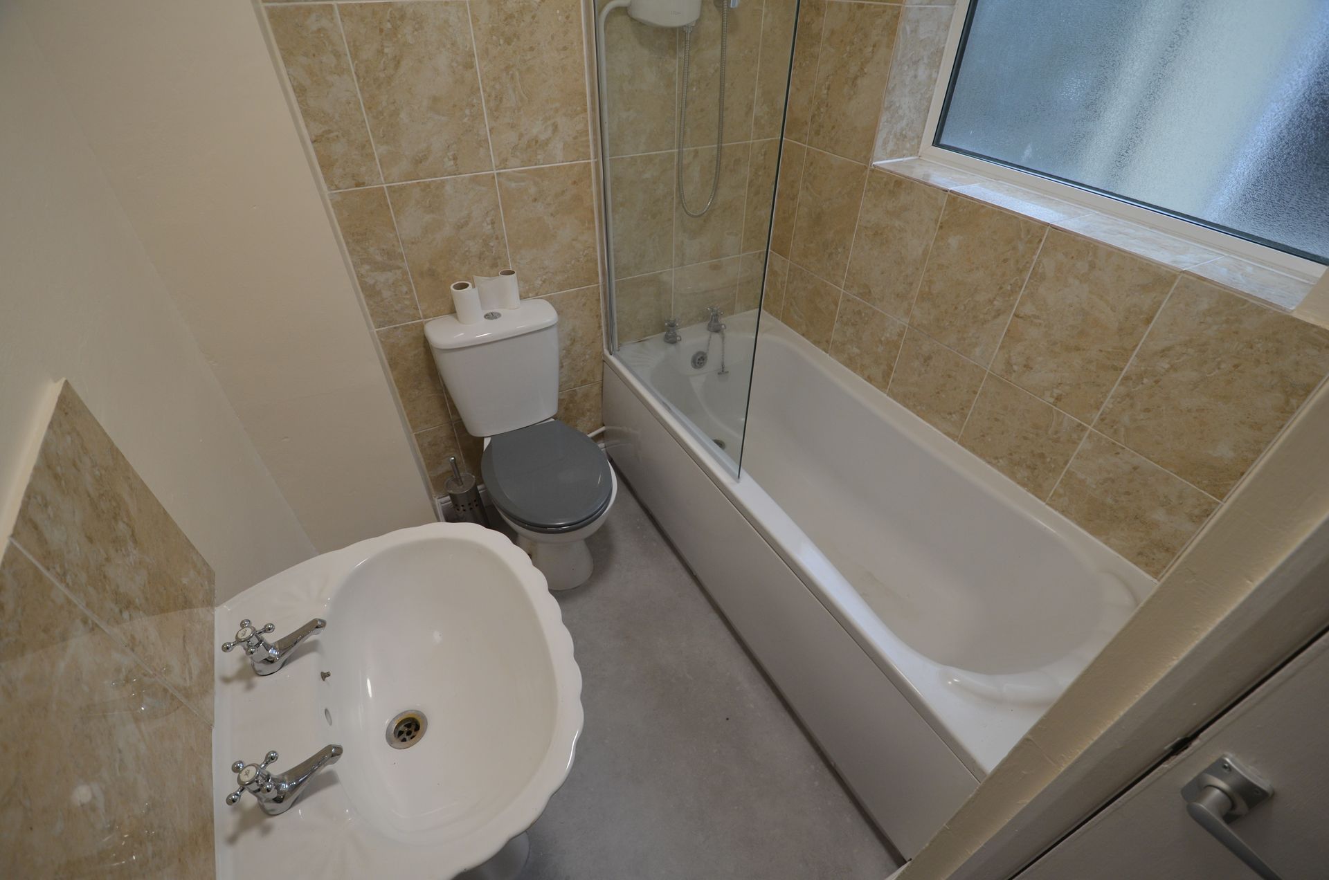 Side aspect double glazed obscured window, panelled bath with chrome taps, electric shower with shower head and hose, shower screen, WC, pedestal wash basin with chrome taps, tiled splashbacks, radiator, carbon monoxide alarm, airing cupboard housing the gas boiler with shelving, ceiling light, and vinyl floor covering.