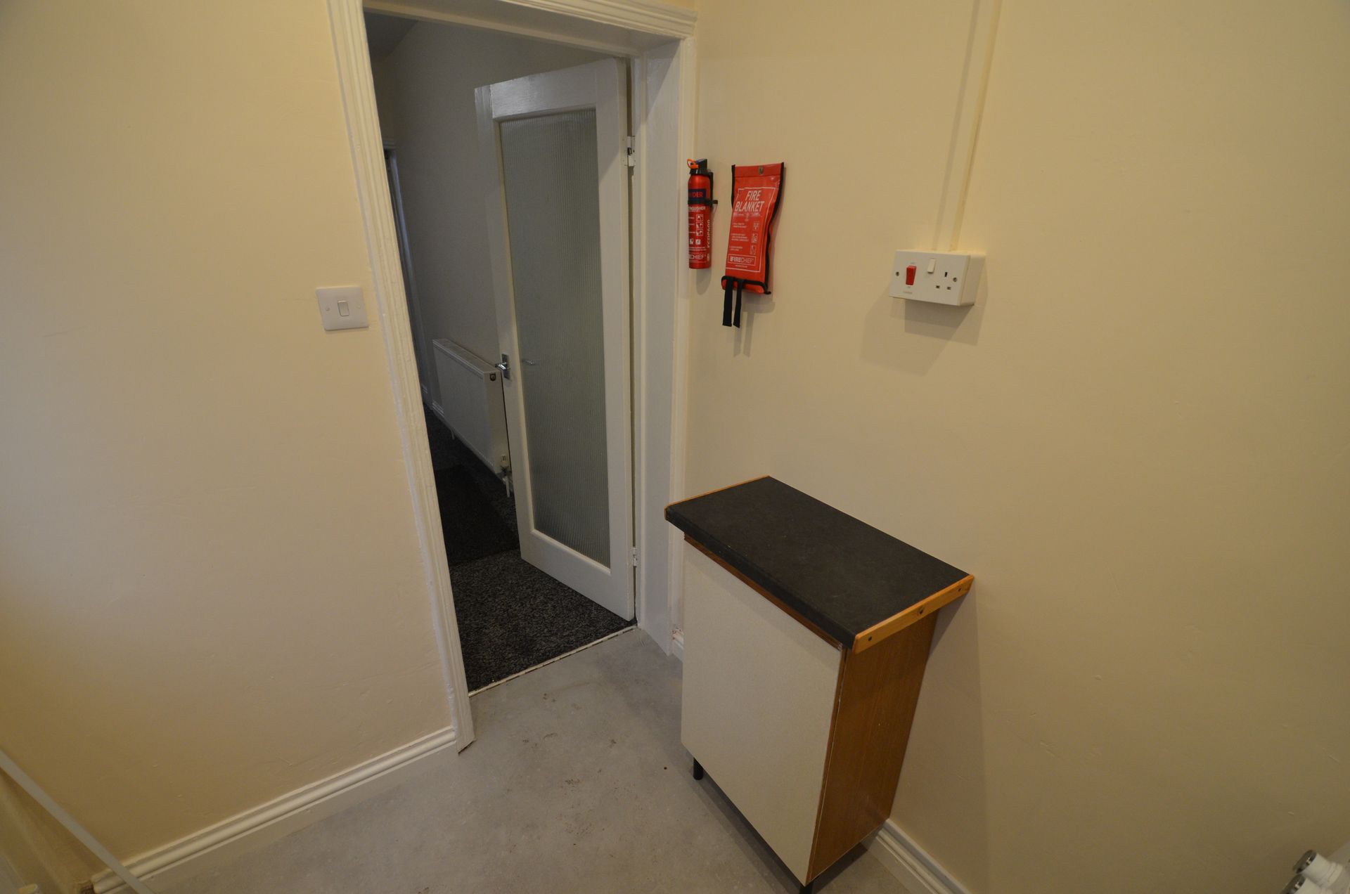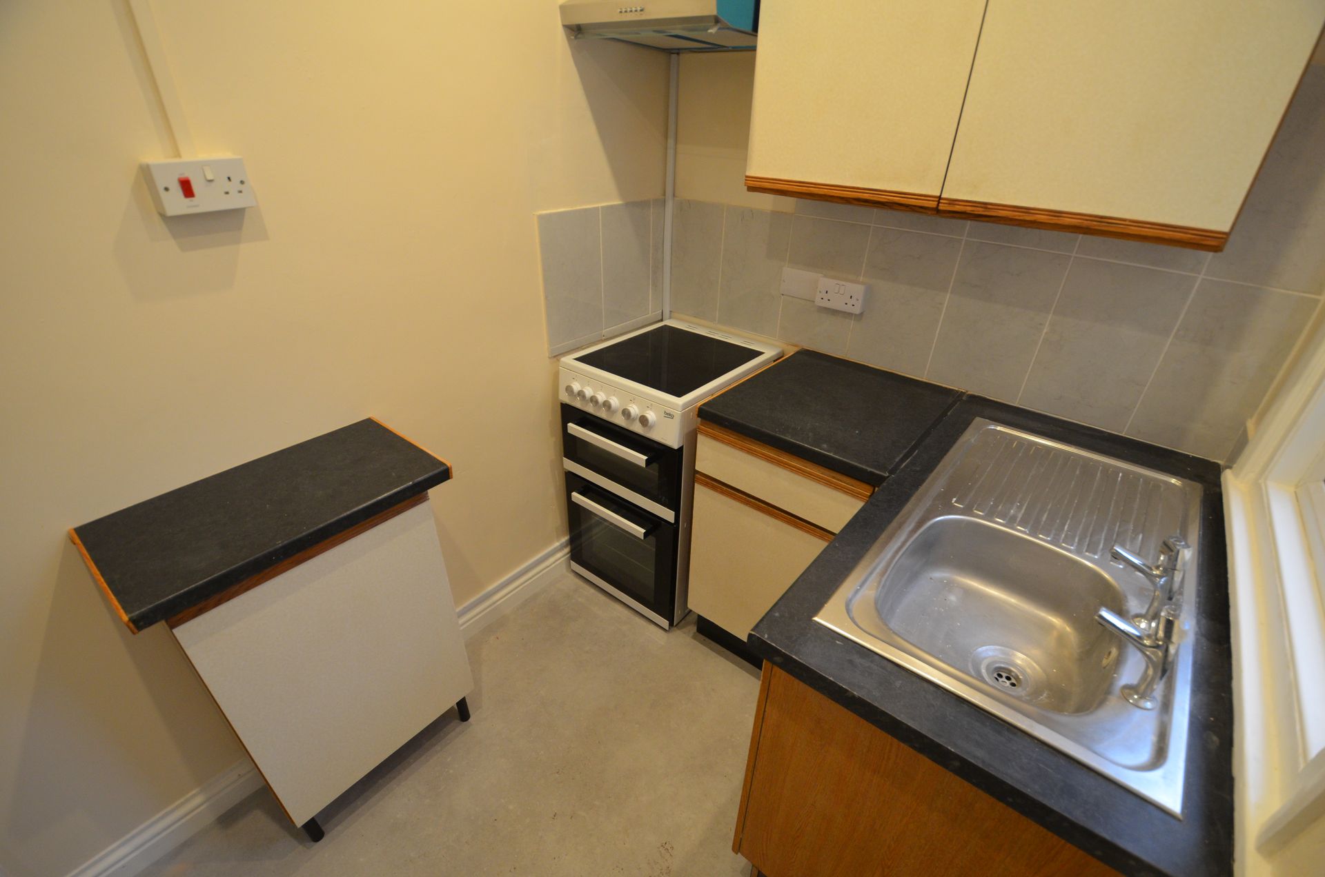 - Fitted kitchen with electric cooker and rear access door