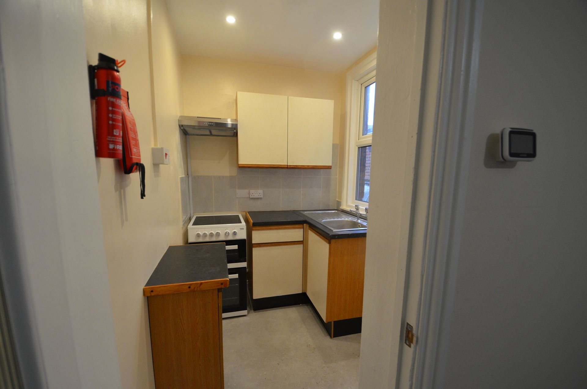 Side aspect double glazed window, single bowl stainless steel sink with drainer and chrome mixer tap, wall and base storage units, tiled splashbacks, worktop surfaces, electric cooker, fire extinguisher and fire blanket, cooker hood, uPVC double glazed rear access door, recessed downlights, and vinyl floor covering.