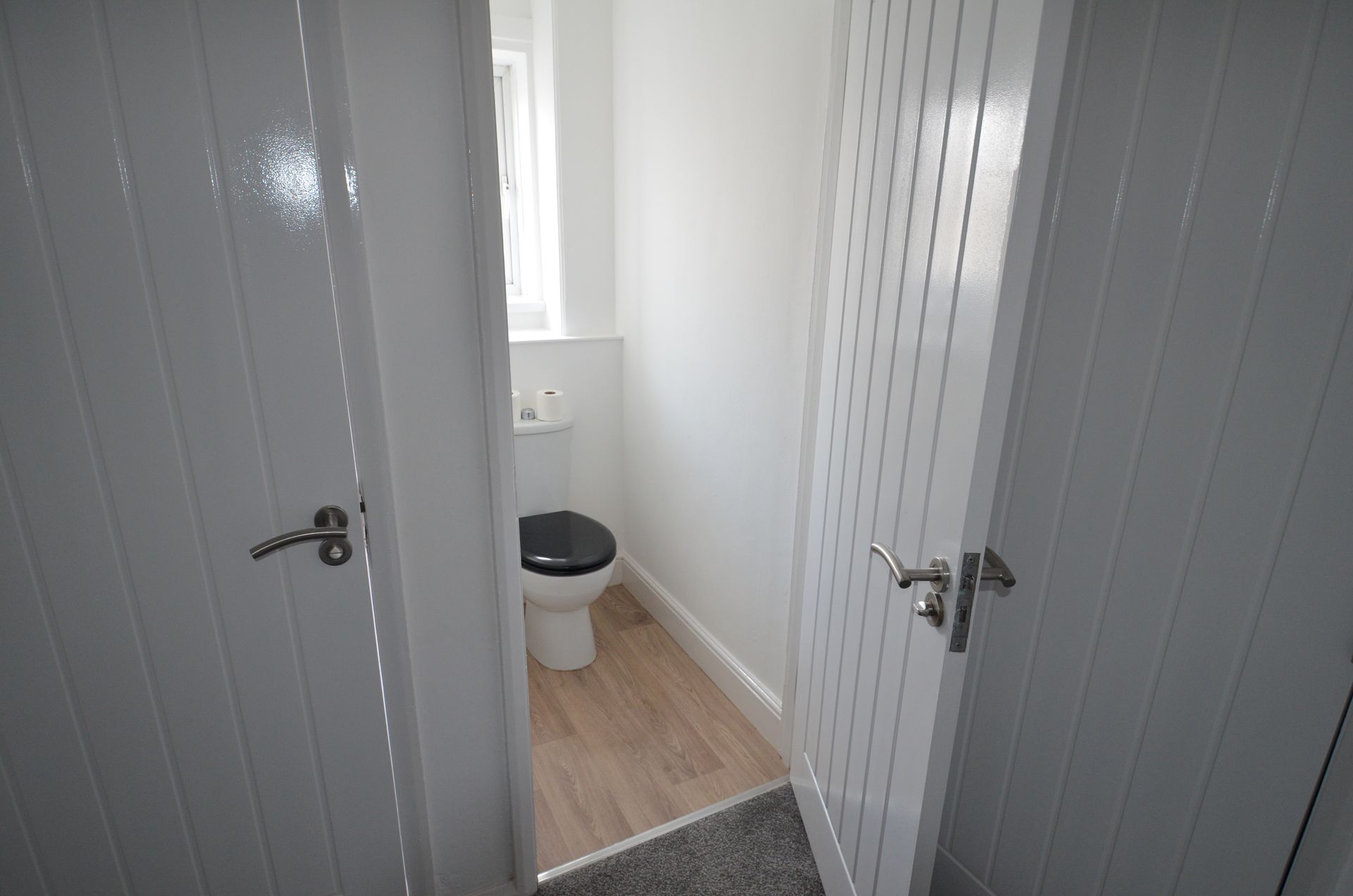 Rear-aspect WC with obscured double-glazed window, WC suite, ceiling light, and vinyl flooring.