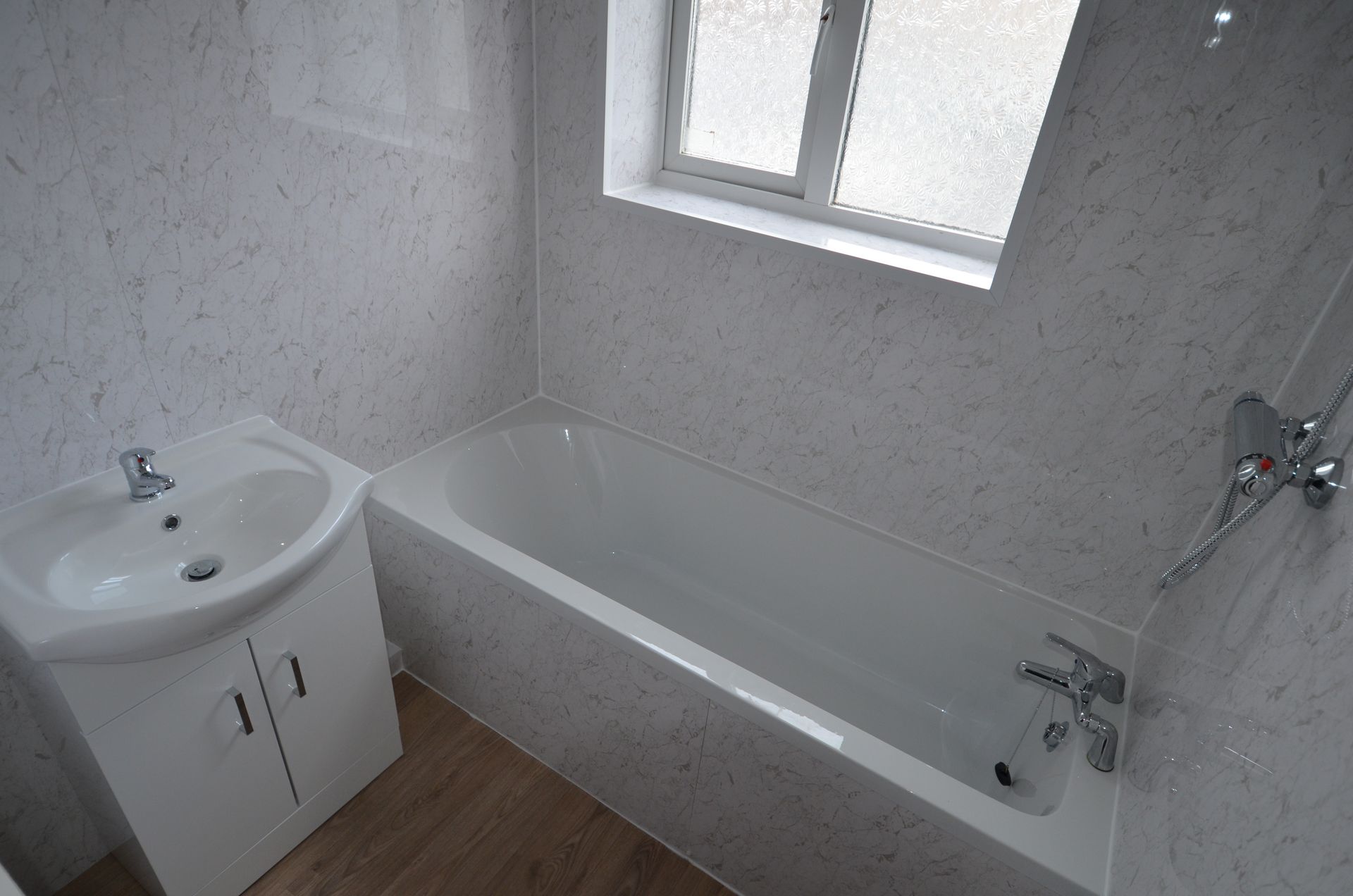 Rear-aspect bathroom with an obscured double-glazed window, panelled bath with chrome mixer tap, thermostatic shower with hose and riser rail, shower rail and curtain, wall cladding, extractor fan, countertop wash basin with vanity unit below, enclosed ceiling light, and vinyl flooring.